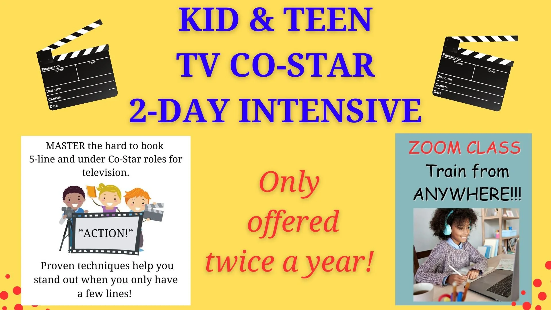This 2-Day Intensive will teach a “specific proven skill set” on how to MASTER the hard to book 5 line and under Co-Star roles for television. How do you stand out when you only have a few lines! After this class actors will feel so confident and prepared to nail their next Co-Star audition they’ll be chomping at the bit for their next audition opportunity to be able to use the techniques they learned!